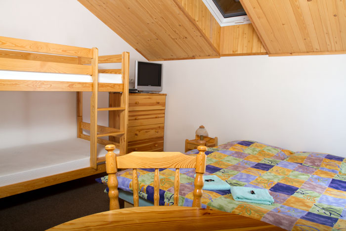Juhozápadný apartmán pomenovaný po Našej druhorodenej dcérke Lei-Viktórii je umiestnený na poschodí Nášho rodinného domu. Je vybavený dvojlôžkom a poschodovou posteľou. Má plnohodnotnú kuchynku (drez, dvojplatnička, mikrovlnná rúra, varná kanvica, štandardné vybavenie kuchyne, chladnička na chodbičke), WC s kúpeľňou, TV/SAT/WiFi a priamy prístup na balkón.