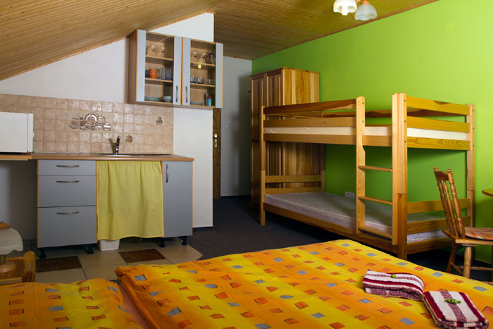 Juhozápadný apartmán pomenovaný po bratovi majiteľa privátu Mrzkáň je umiestnený na poschodí Nášho apartmánového domu. Je vybavený dvojlôžkom a poschodovou posteľou. Má plnohodnotnú kuchynku (drez, dvojplatnička, mikrovlnná rúra, varná kanvica, štandardné vybavenie kuchyne, chladnička na chodbičke ), WC s kúpeľňou, TV/SAT/WiFi a priamy prístup na balkón.